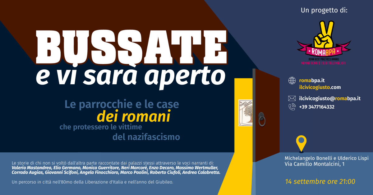 Un lotto di case popolari a Garbatella diventa rifugio. Le storie di chi mise a rischio la propria vita per ospitare e salvare sconosciuti, in nome della solidarietà. Il progetto, promosso da Roma Capitale - Assessorato alla Cultura, è vincitore dell'Avviso Pubblico Artes et Iubilaeum - 2025, finanziato dall'Unione Europea Next Generation EU per grandi eventi turistici nell’ambito del PNRR sulla misura M1C3 - Investimento 4.3 - Caput Mundi